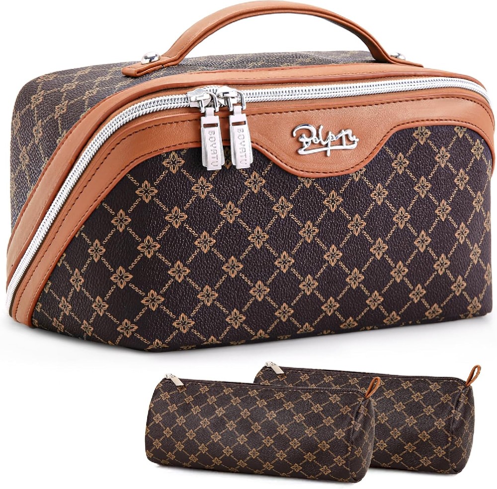 Elevate your beauty organization with this stylish **cosmetic/toiletry bag**. Crafted from premium leather-like material in a timeless brown hue, it exudes a vintage charm that complements any aesthetic. The bag features a roomy interior with smart partitioning, effortlessly accommodating all your makeup essentials, skincare products, or toiletries. Its sturdy handle makes it easy to carry, whether you're heading to the bathroom, traveling, or just keeping your vanity tidy. Combining fashion and function, this bag is a must-have for anyone seeking a chic and practical solution to keep beauty items organized and accessible.